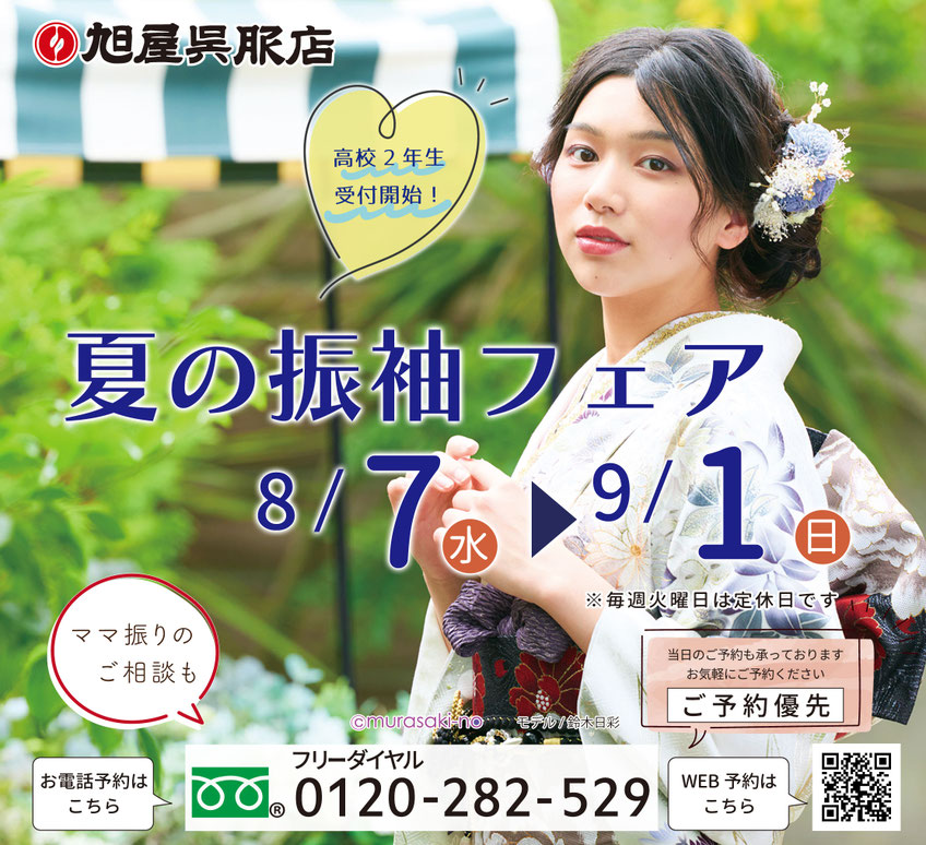 旭屋呉服店は大正2年の創業以来、地域に根差した商いを続けて参りました。成人の年の振袖選び、お写真撮影、そして成人の日当日。すべての事がすてきな思い出となるように、お客様お一人お一人に寄り添い、「旭屋呉服店でよかった」と思っていただけるよう、心を込めてお支度させていただきます。ご不安なことはどうぞご相談ください。